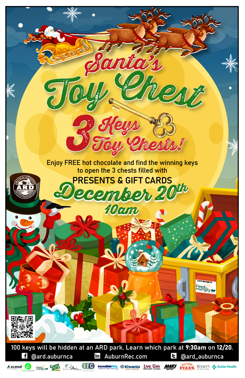 ARD will hide 100 KEYS in one of its parks. One of THREE of the keys each day will unlock one of THREE Santa’s toy chest containing gifts and gift cards from Auburn businesses. Find a key and check Santa’s Toy Chests at the park where the keys are hidden to see if yours is the winning key! Any child that finds a key will automatically win a stuffed animal prize, even if their key does not open one of Santa’s Chests. FREE hot chocolate will be available!