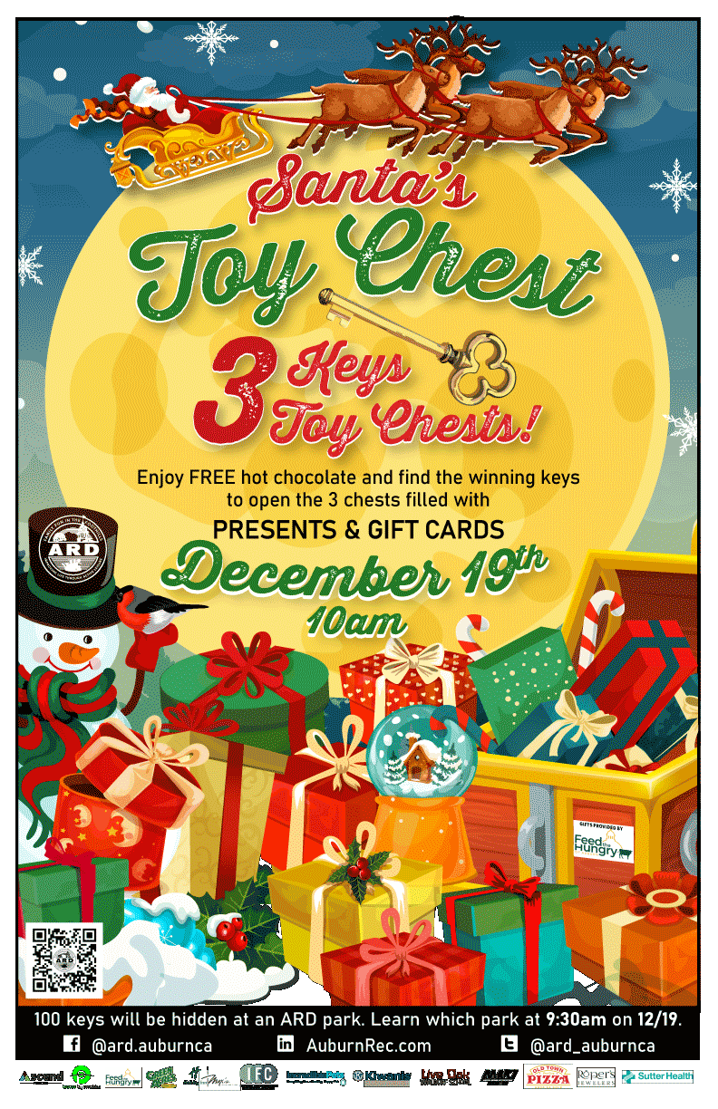 ARD will hide 100 KEYS in one of its parks. Three of the keys will open one of the three Santa’s toy chests, containing gifts and gift cards from Auburn businesses. Find a key and check Santa’s Toy Chests at the park where the keys are hidden to see if yours is the winning key! Any child that finds a key will automatically win a stuffed animal prize, even if their key does not open one of Santa’s Chests. FREE hot chocolate will be available!